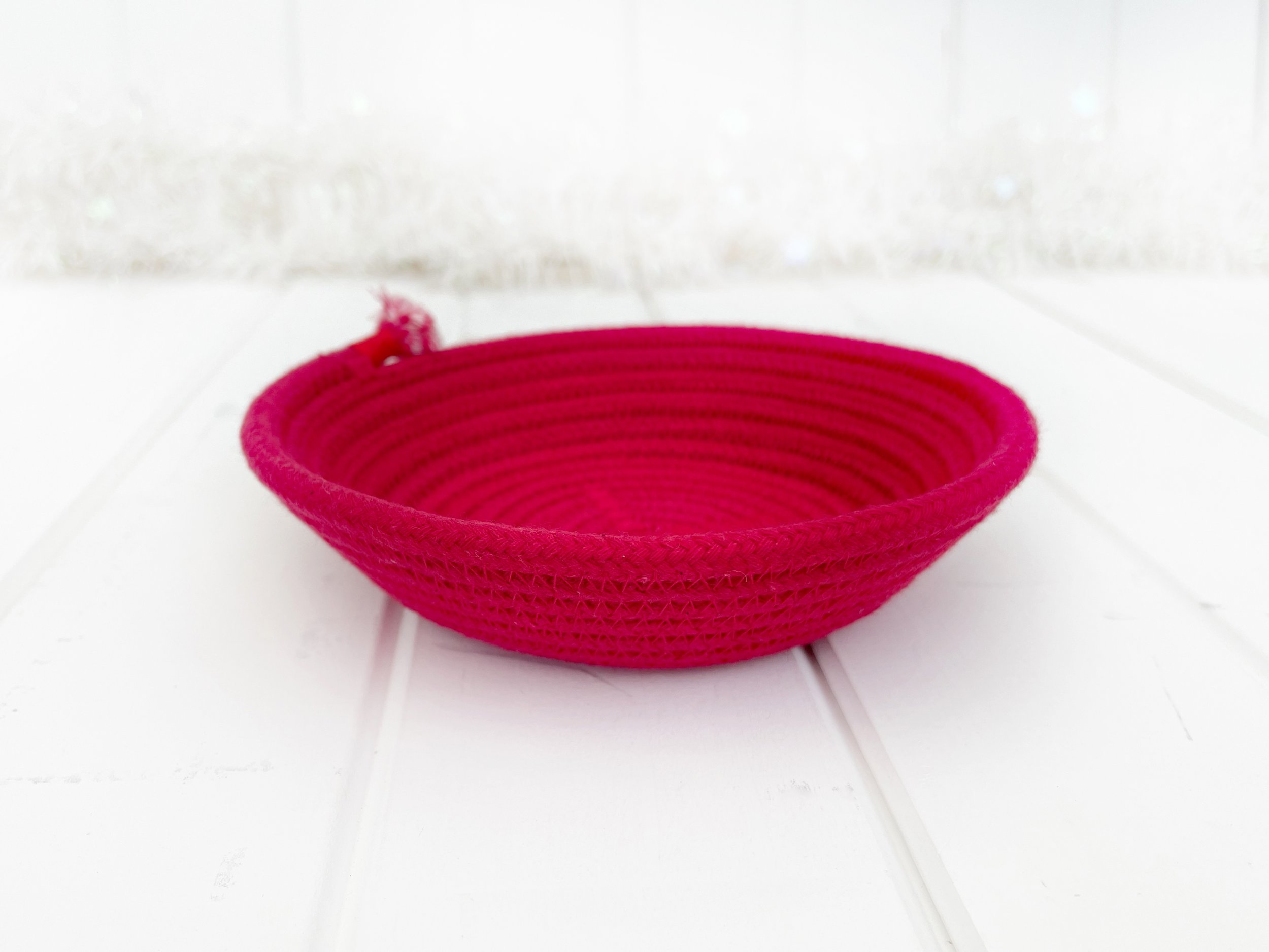 Pink orange and red retro looking fabric trimmed cotton rope bowl