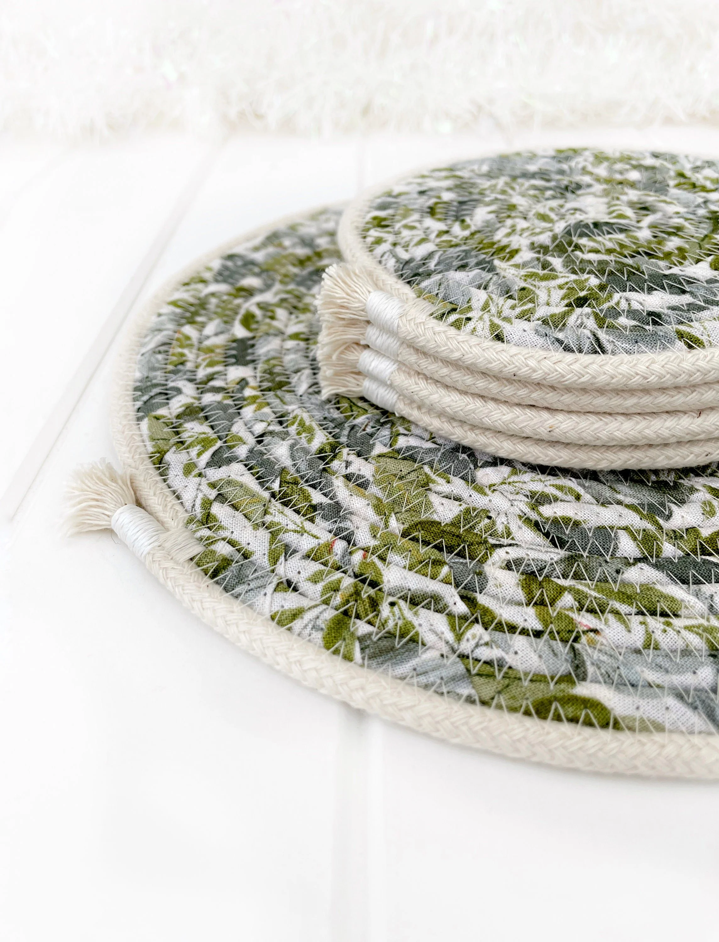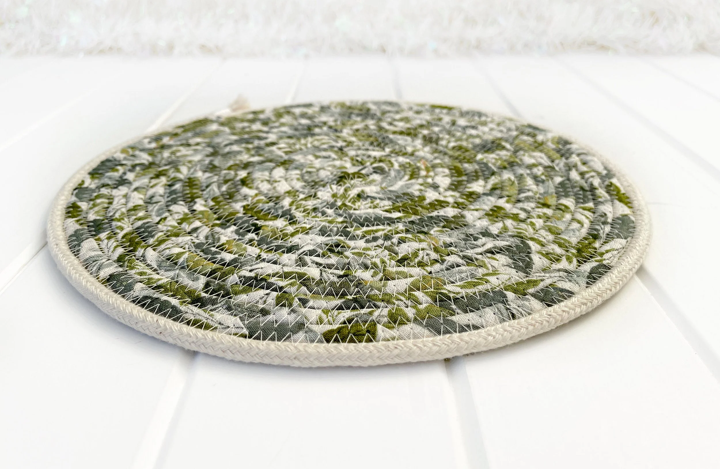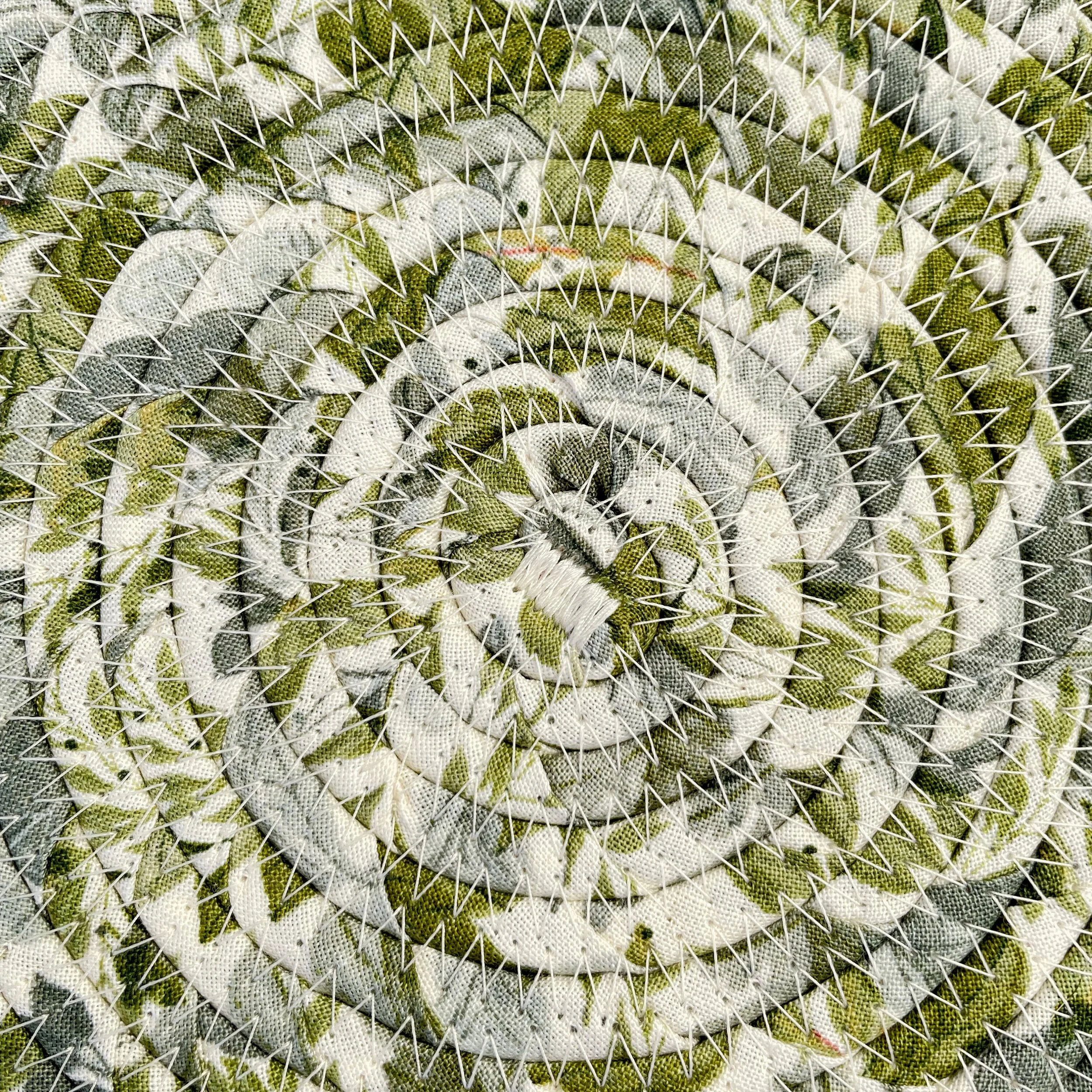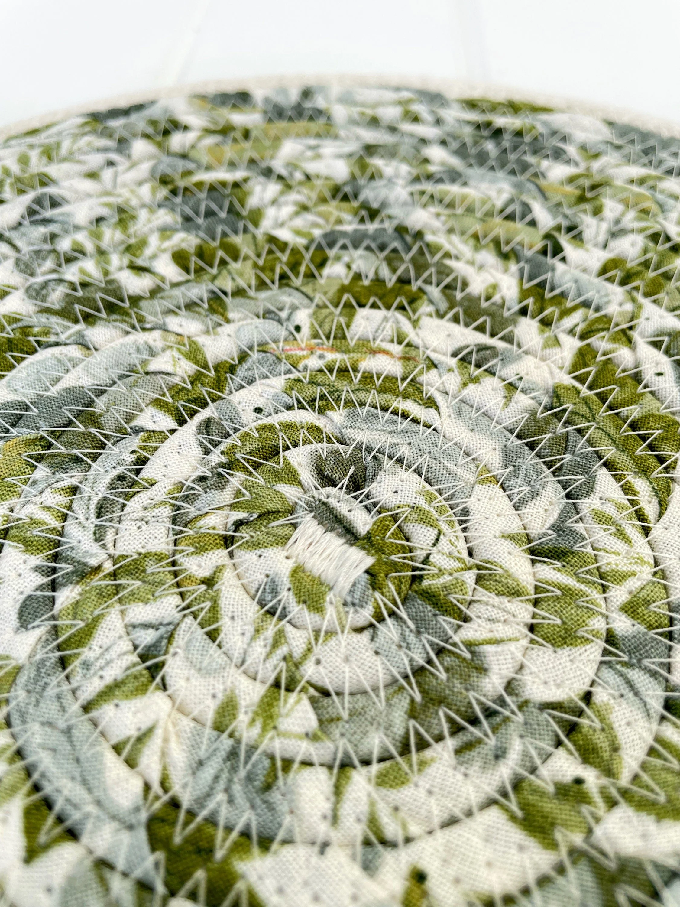 Natural cotton rope bowl highlighted with a fabric belly of sage green leaves